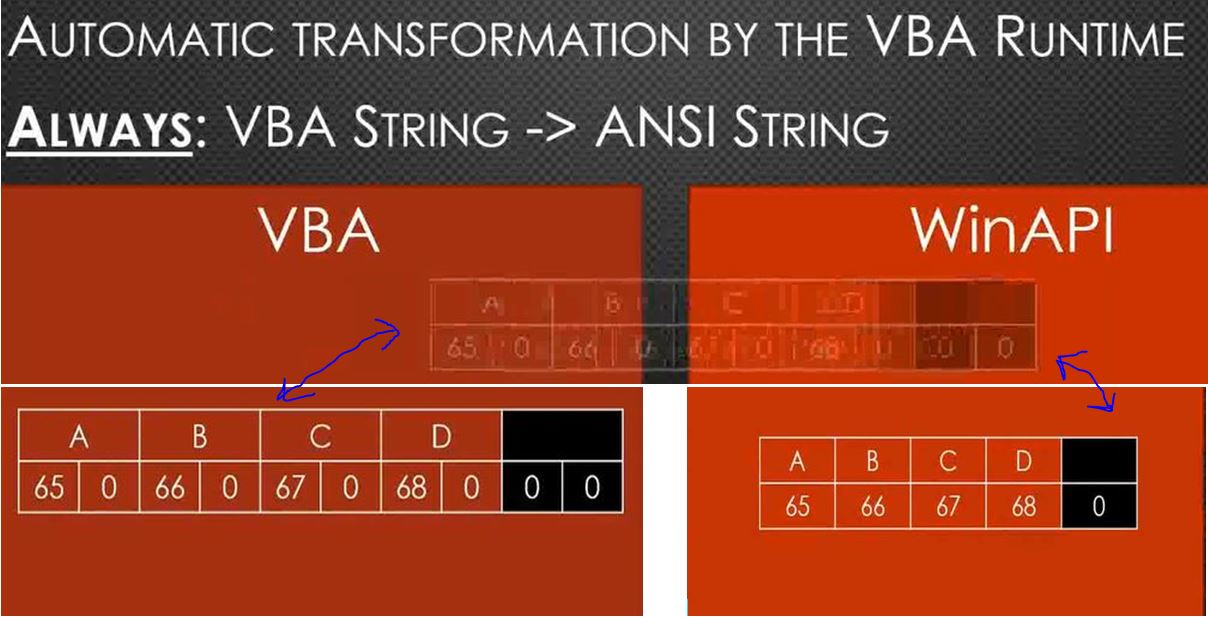 There seems to be no official documentation to the following anomaly. ** However, this sounds reasonable: VB strings are stored in UNICODE, but all API calls are made with ANSI strings. This is accomplished by converting any string passed to an API call to ANSI before the call and back to UNICODE afterwards. While this conversion is transparent to the user most of the time, it makes it impossible to pass a UNICODE string from VB to a DLL via an argument typed As String in a Declare statement. Similarly, any structure which contains strings will go through the double conversion process during an API call. https://i.postimg.cc/28bPrbNj/Runtim...API-string.jpg