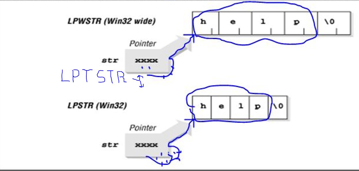 Pointers in general seem to be flexible things, and we have a LPTSTR which will effectively view the final character string as appropriate: LPTSTR, designates a general type that can be compiled for either Windows code pages or Unicode.