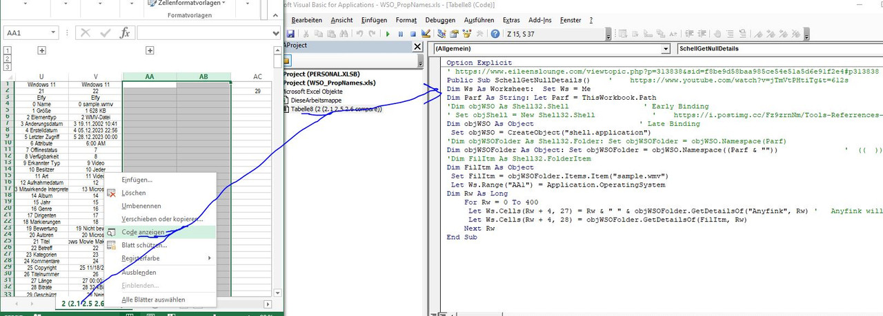 Now run the only macro in it, WSO_PropNames.xls and run Sub SchellGetNullDetails() ( Tabelle8.SchellGetNullDetails
