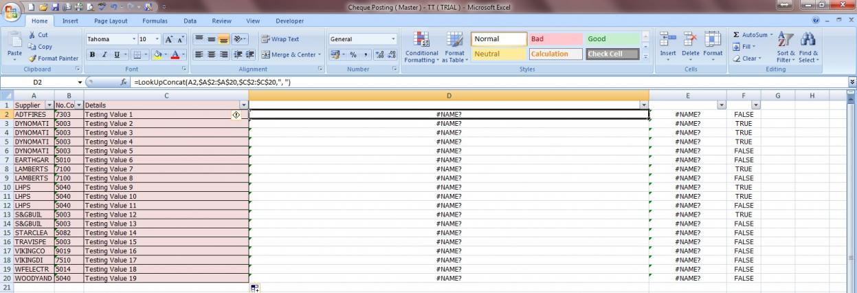 Has this been responded to? I have the same predicament that I am trying to solve for. In short, the lookup_Concat UDF works very well for validating a single criterion and returning the concatenated results into a single cell. However, in my particular use case, I have 2 criterion that require validation prior to returning the concatenated results. This would be equivalent to an "=if(and(" type function. Is this possible, and if so, any assistance in how to properly operate it would be very much appreciated.