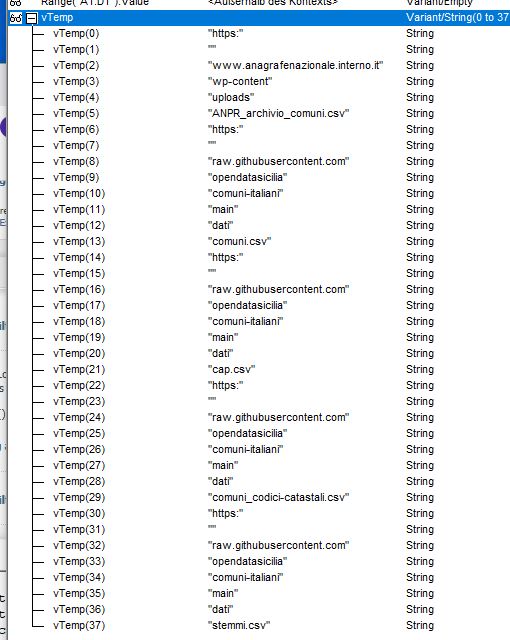 Let vTemp = Split(vTemp, ",", -1, vbBinaryCompare) ' _ the split of the modified string by the , separator , to give a long single array 1 dimensional array,