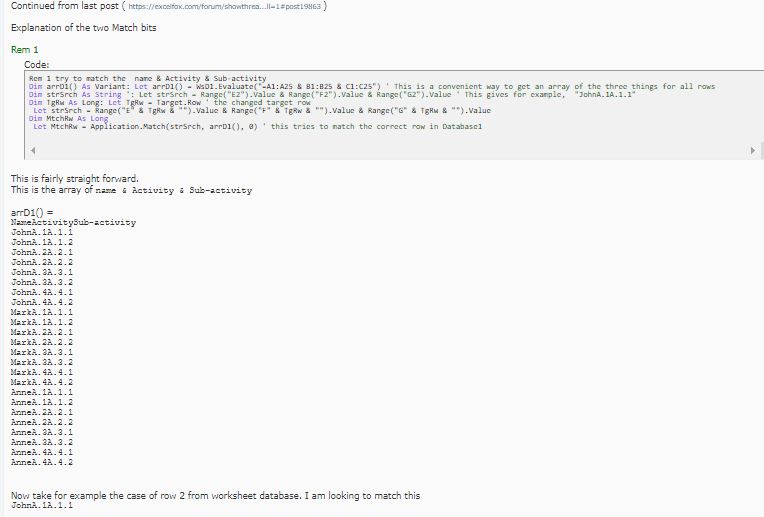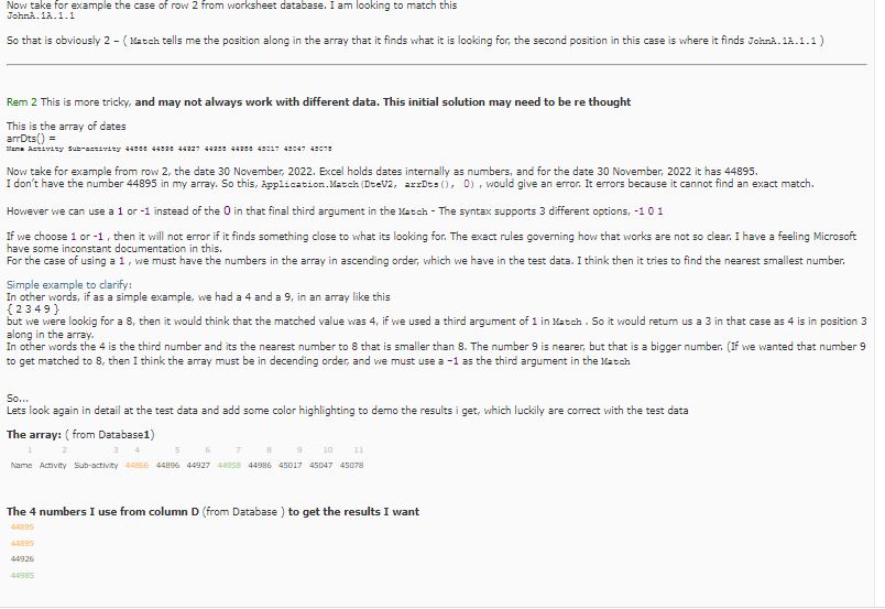 Let MtchRw = Application.Match(strSrch, arrD1(), 0) ' this tries to match the correct row in Database1