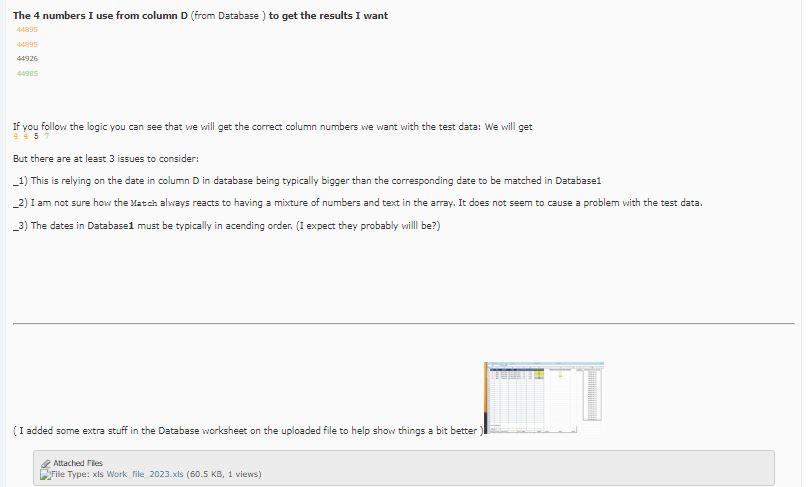 _1) This is relying on the date in column D in database being typically bigger than the corresponding date to be matched in Database1