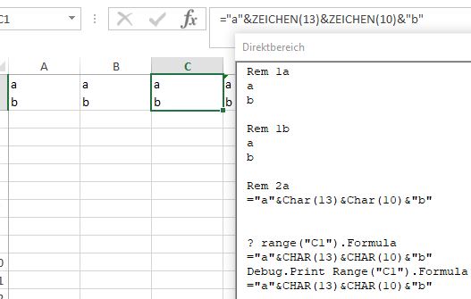 So finally, in ' 2a we have a string construction that we are happy with to put a formula in a cell which will be the Excel spreadsheet formula, ="a"&Char(10)&Char(13)&"b" , as indeed we see both in the formula Bar, and in the immediate window if using