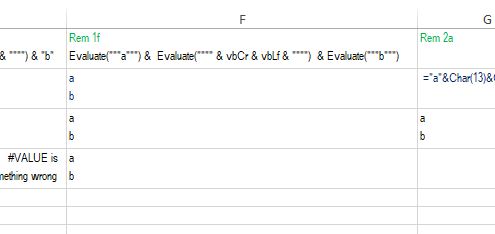 To this consideration of the character a is a parallel to the Characters vbCr & vbLf - Doing this Evaluate("""" & vbCr & vbLf & """") gives us the same results as pseudo putting ="""" & "NewLineCharacters" & """" in a cell, although that pseudo syntax, NewLineCharacters , is not recognised, but the underlying shared innards working does the same, and the result from that world be, … well a bit difficult to show, but something pseudo like ,