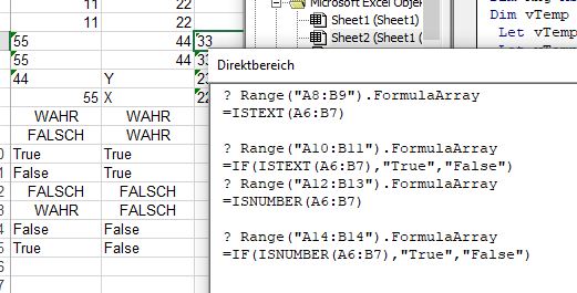 Let vTemp = Evaluate("=IF(ISTEXT(A6:B7),""True"",""False"")") '
