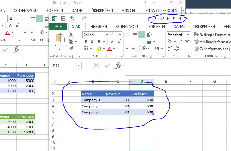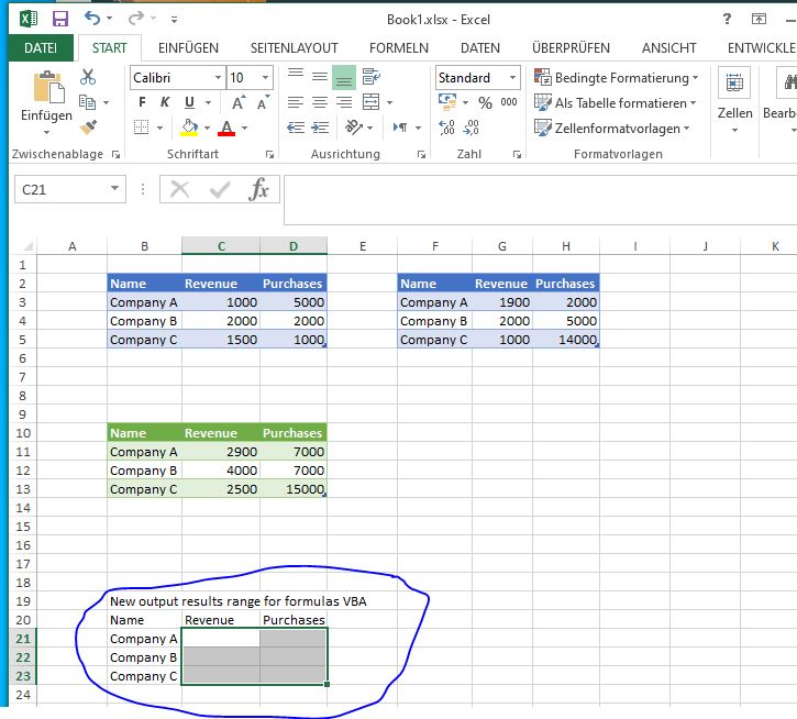 ' Let Workbooks("Book1.xlsx").Worksheets("Sheet1").Range("C21:D23") = "=SUM(C3,G3,'C:\Users\acer\Desktop\[Book2.xls]Tabelle1'!C3)"