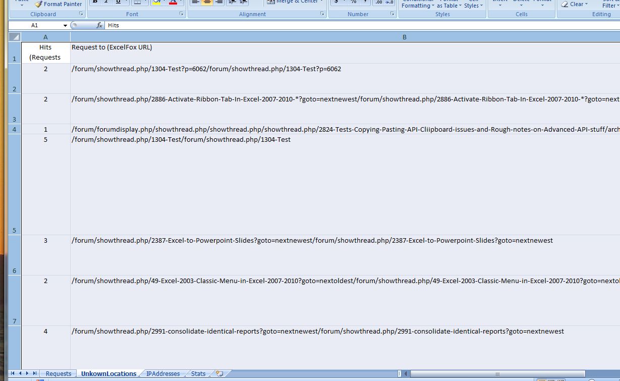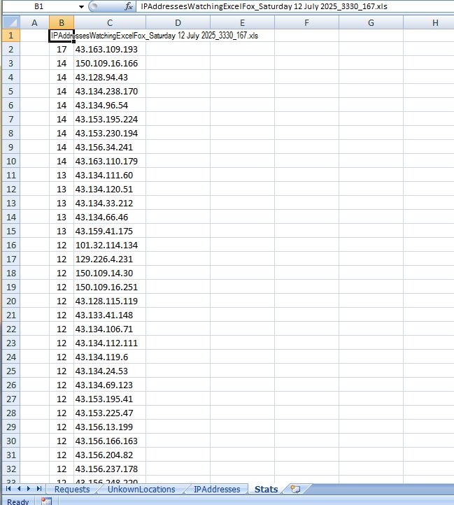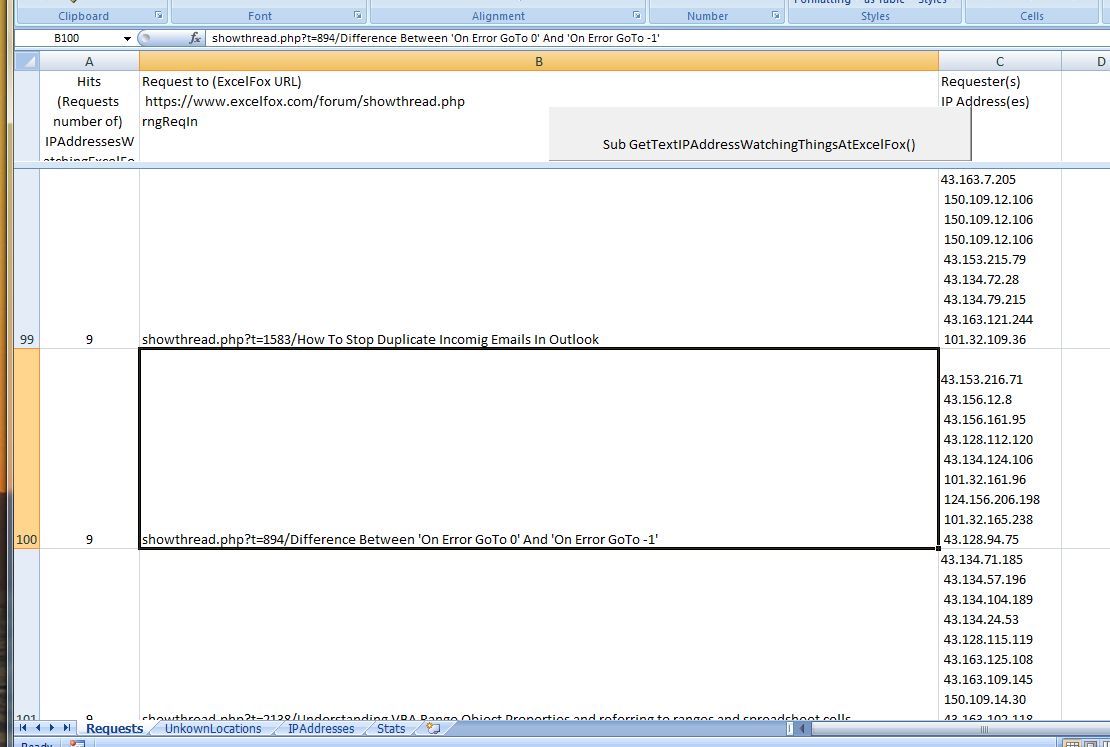 Set WsReq = ThisWorkbook.Worksheets("Requests"): Set WsIP = ThisWorkbook.Worksheets("IPAddresses"): Set WsReqErr = ThisWorkbook.Worksheets("UnkownLocations"): Set WsSts = ThisWorkbook.Worksheets("Stats")